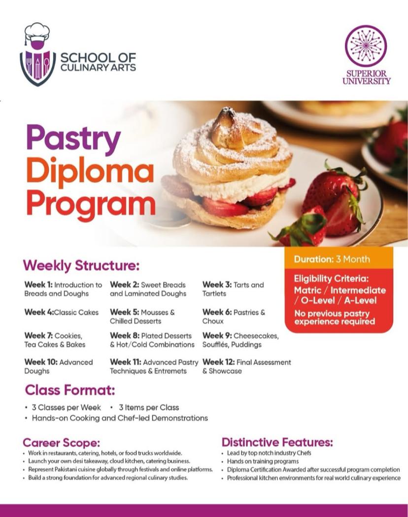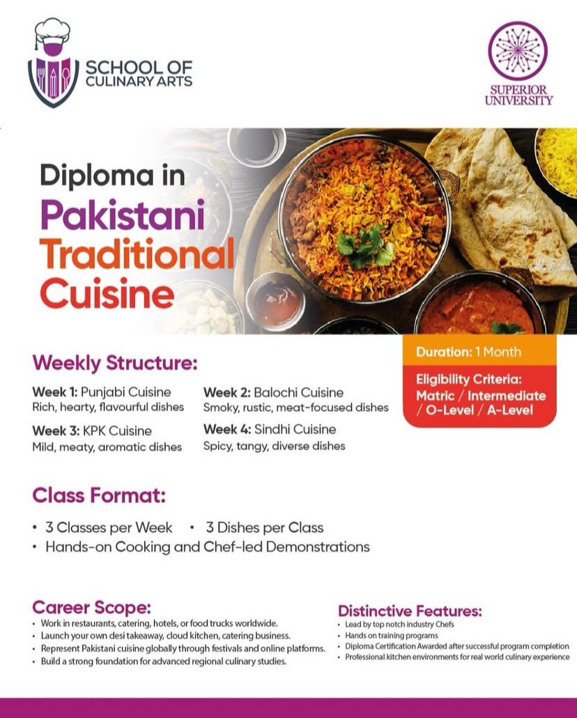 Turn your culinary passion into a professional career with internationally recognized diploma programs at the School of Culinary Arts, Superior University. Our expert-led training, modern facilities, and 100% job placement guarantee ensure that you gain the skills, confidence, and certification to excel in the global culinary industry.